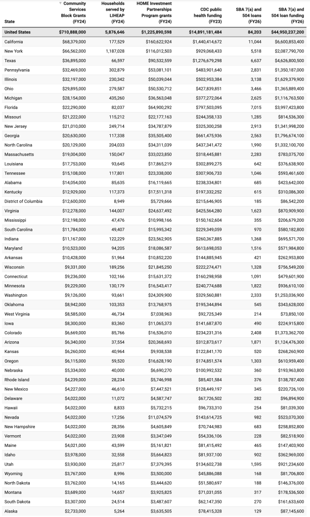 A state-by-state breakdown for selected federal programs that the president’s fiscal year 2027 budget proposes cutting